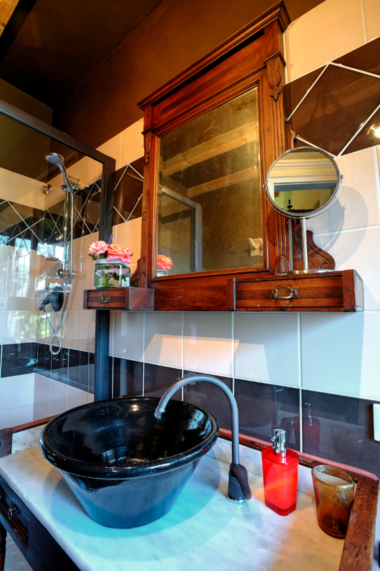 This bright and spacious room is furnished with vintage pieces of furniture and keeps the original Tuscan terracotta floor intact. The ceiling is decorated with wooden beams and bright colors. It’s located on the second floor and overlooks the park of the Villa, which makes it one of the coziest rooms.